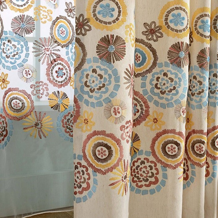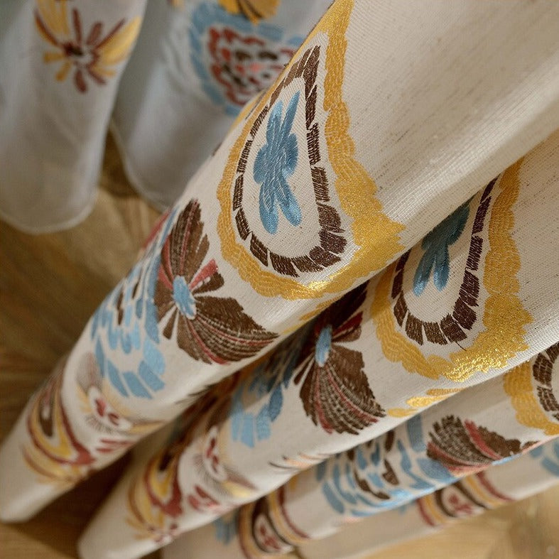 • Motif ethnique brodé avec rondes fleurs d’ocres, jaune et bleu doux; style bohème