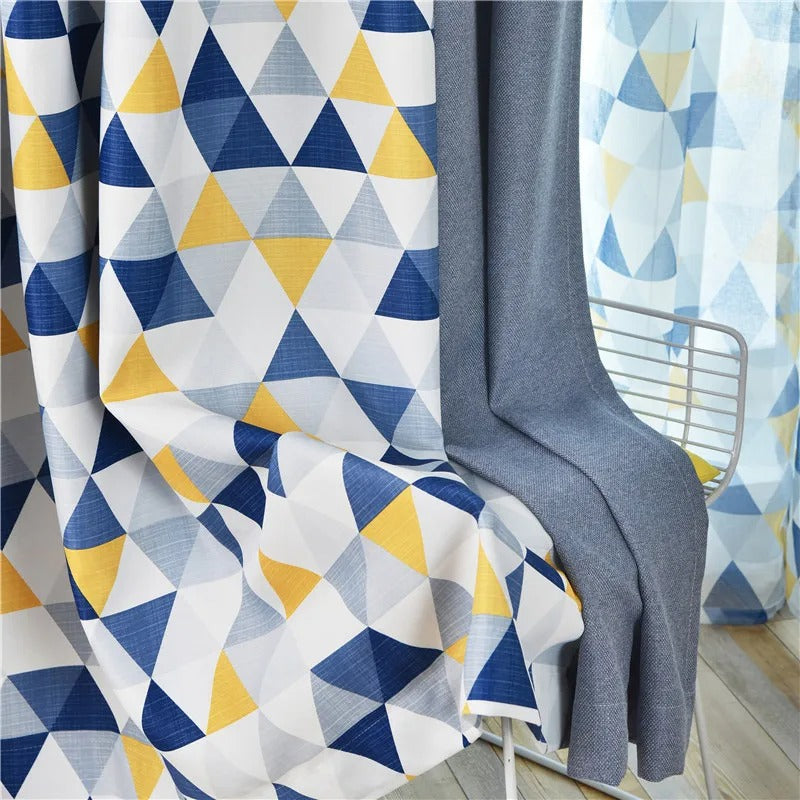 • Couleurs des triangles : bleu marine, jaune, gris et blanc, motifs triangles qui s'entremêlent sur le tissu