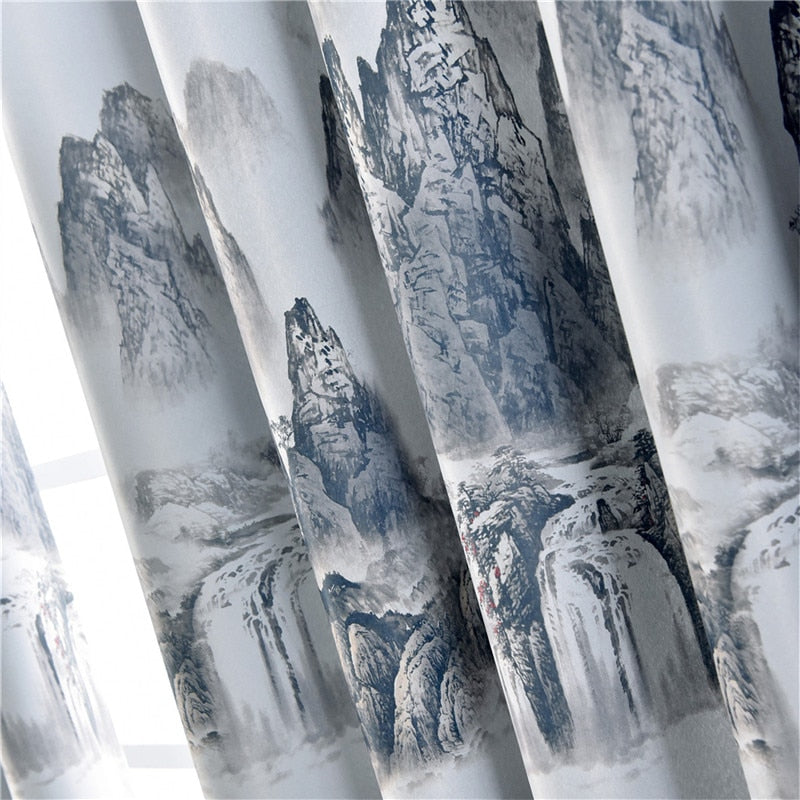 • Rideau opaque court, inspiré par le Japon, avec motifs montagnes et cascades