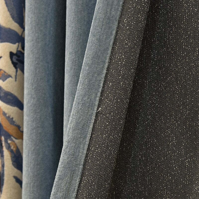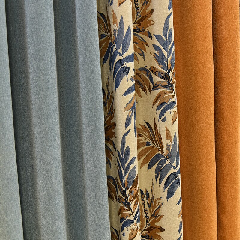 • Rideau occultant composé de 3 bandeaux de couleur et de tailles différentes: large bande bleue, bande moyenne à motifs floraux, et fine bande orange ou moutarde; tissé en velours à jacquard pour un rendu unique.