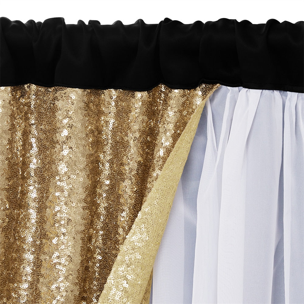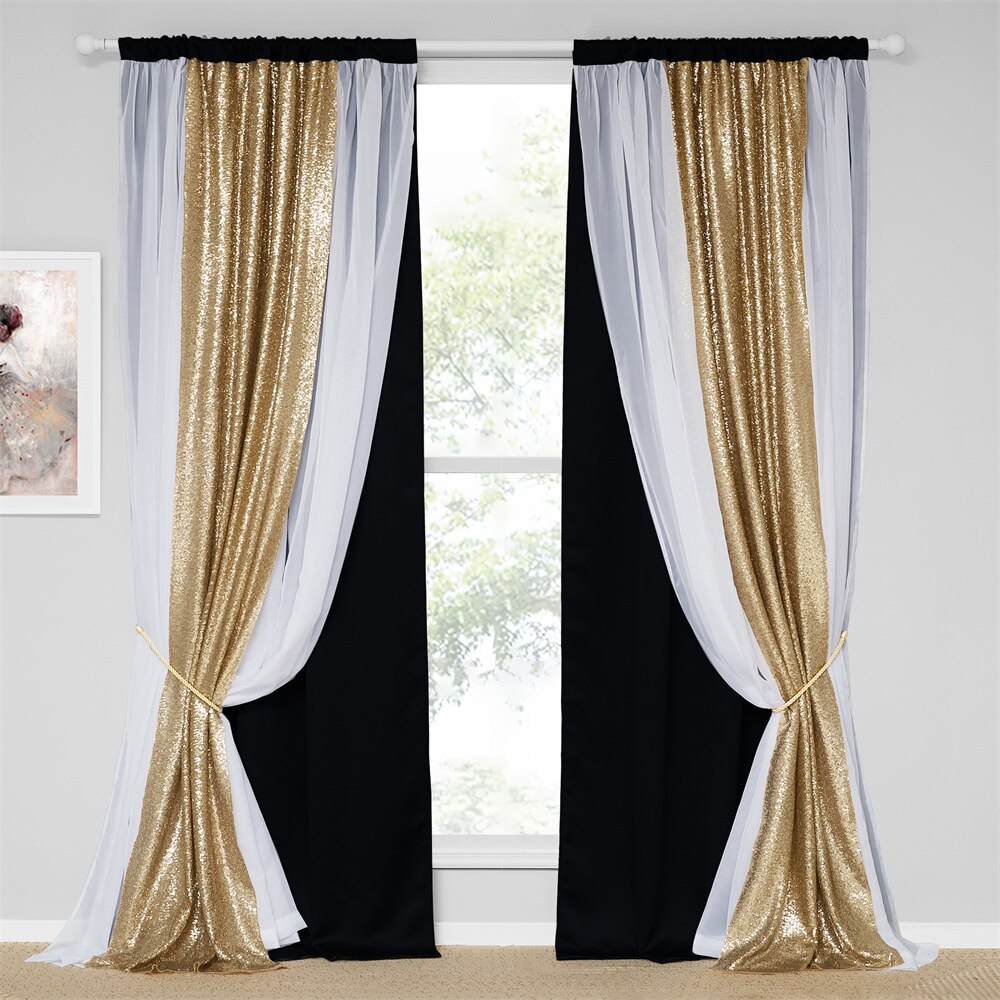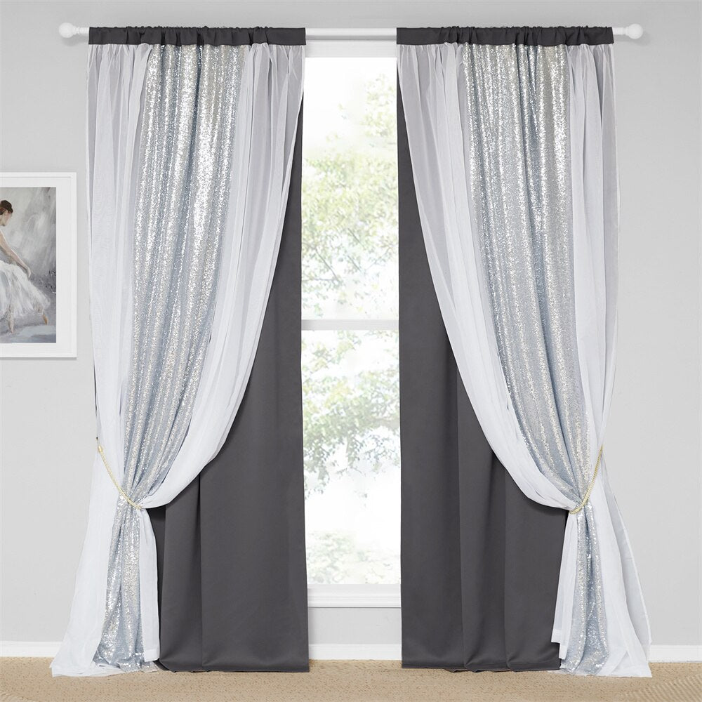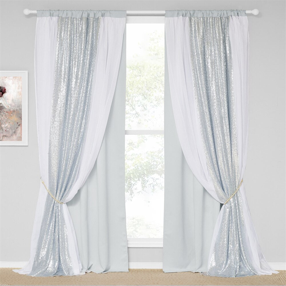 • Détails : Double rideau (1 toile opaque + 1 voilage avec toiles paillettes intégrées, la toile à paillettes étant plus longue que l’opaque)