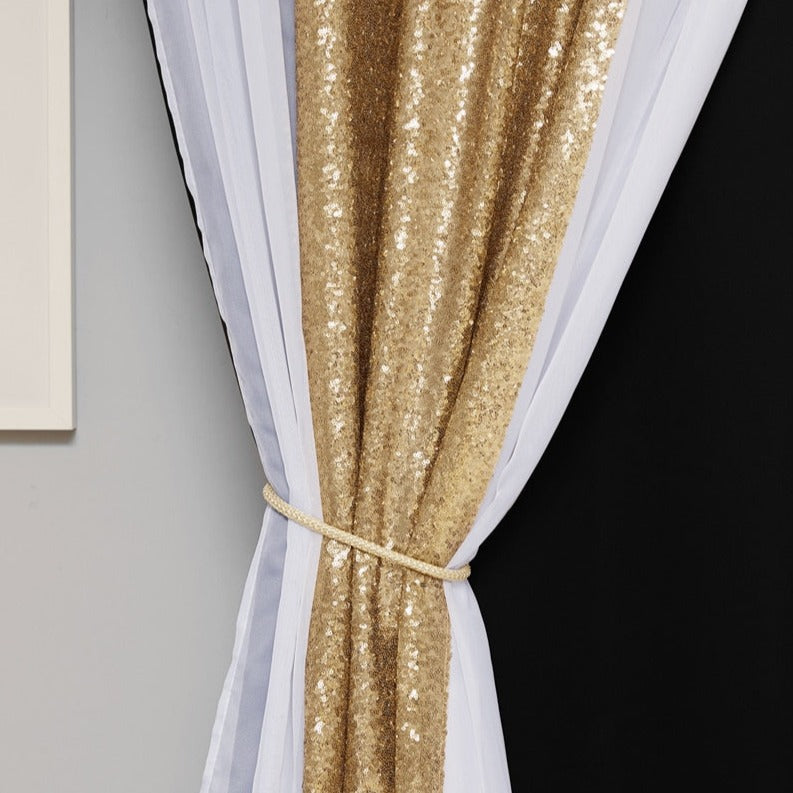 • Voile pailleté pouvant se joindre en mode "bonne-femme" grâce au cordon d'embrasse offert, pour laisser voir la toile occultante