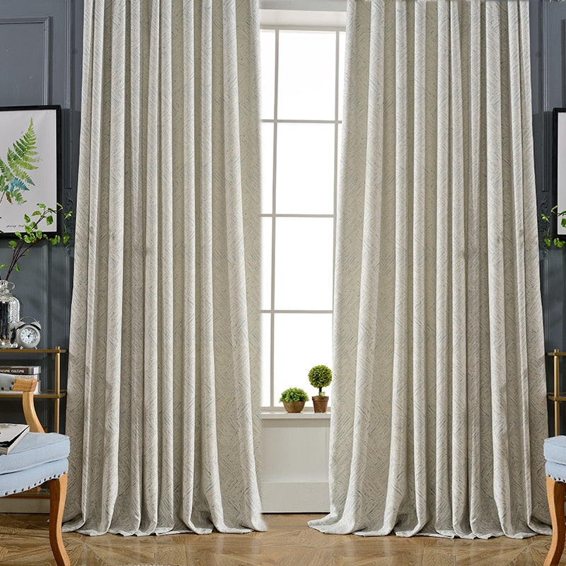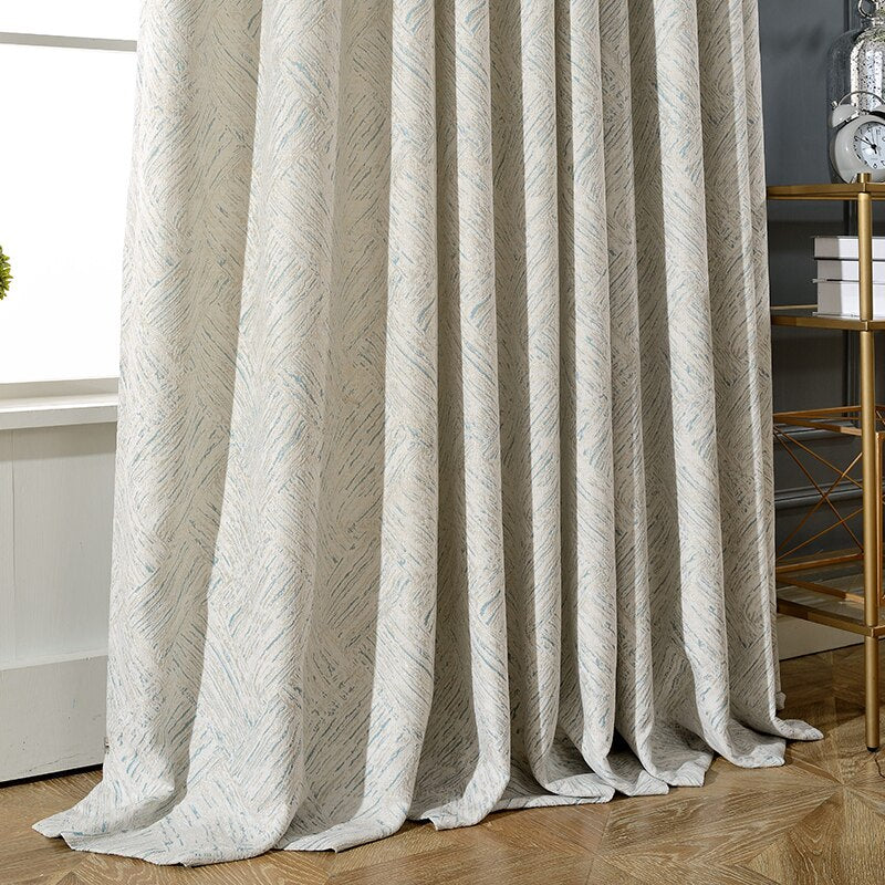 • Catégorie: Rideau occultant pastel – Rideau Occultant Erzen, ton lait pastel damassé de bleu éteint, toile épaisse et de qualité, isolation lumière et chaleur, style élégant.