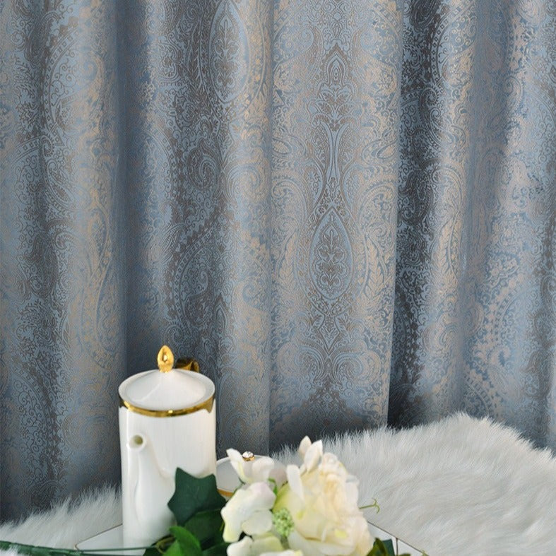 • Motif et tissage : damassé en volutes florales d'inspiration orientale, motif discret