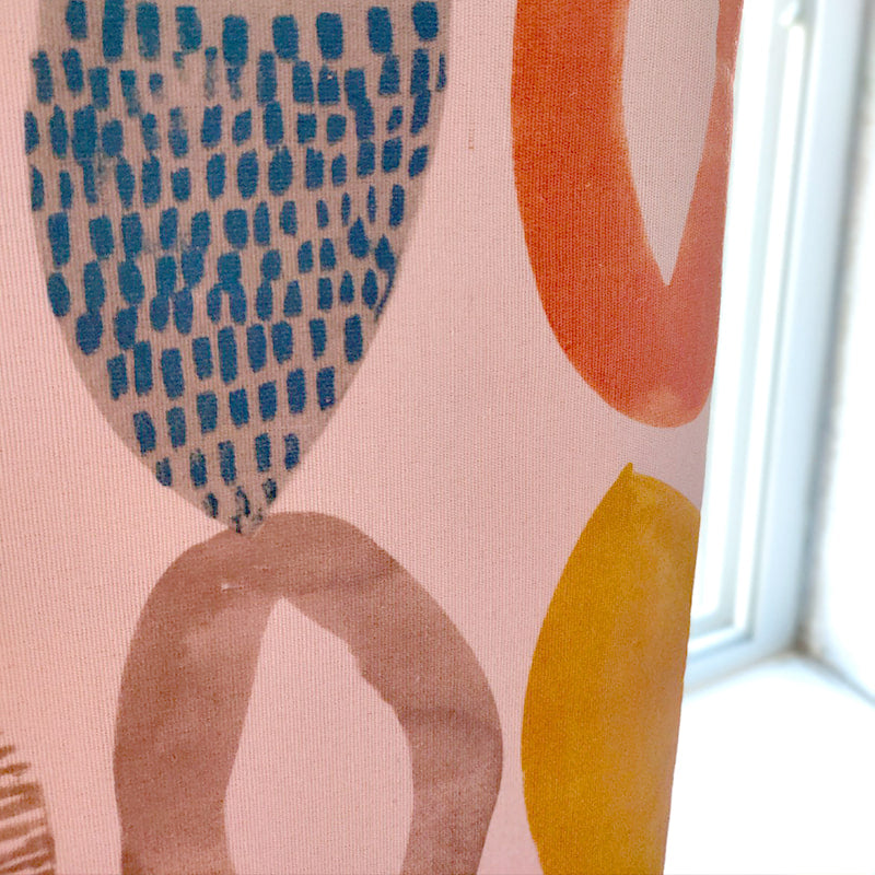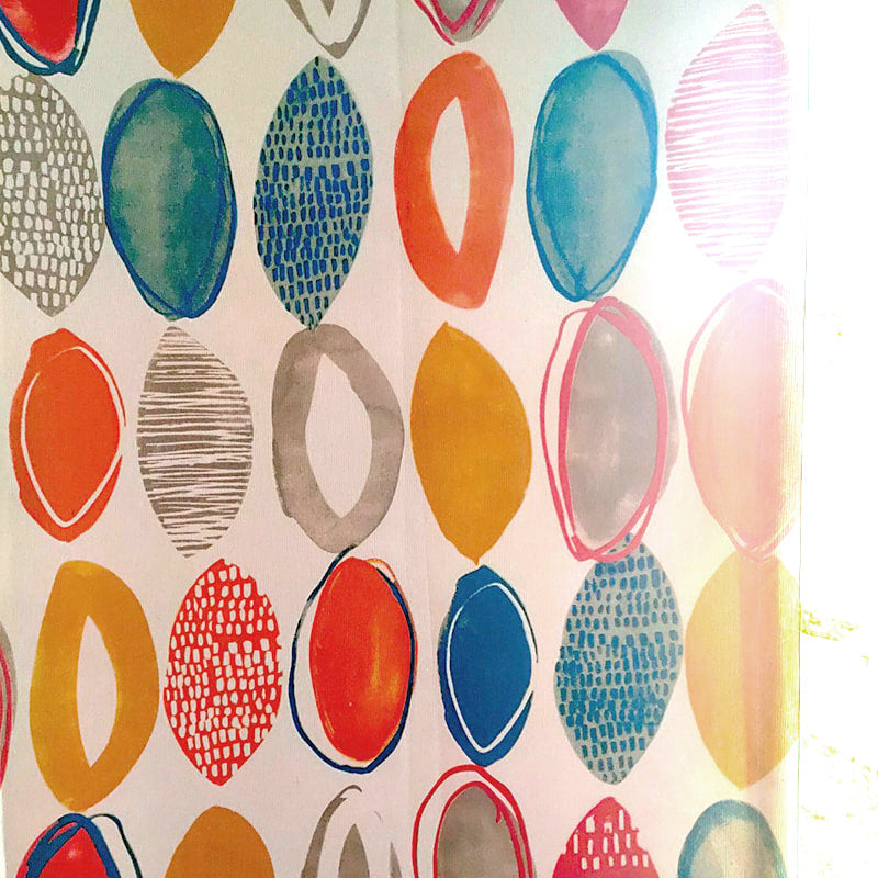 • Opaquité et motifs: Opaque à 75 %, motifs organiques ocres et bleus évoquant des noix de cocos oblongues sur fond blanc