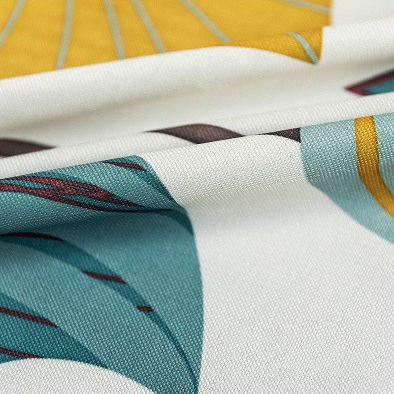 • Style Scandinave : Rideau Style Scandinave Weito avec fond blanc imprimé de grandes feuilles turquoise et ocre
