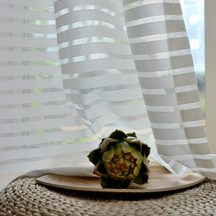 • Design: voile blanc à rayures horizontales épaisses, semi-opaque avec un léger effet store déployé