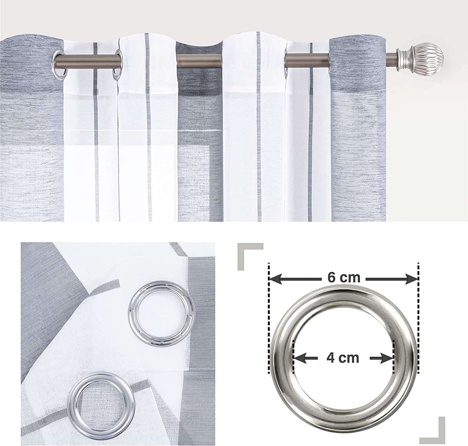 • Accroches et tenue : Œillets (intérieur 4 cm), Galon fronceur (ruflette) hauteur bande 7 cm, Pattes hauteur à plat 7.5 cm, Passe-Tringle hauteur fourreau à plat 5 cm, Plis Flamands hauteur bande 7 cm.
