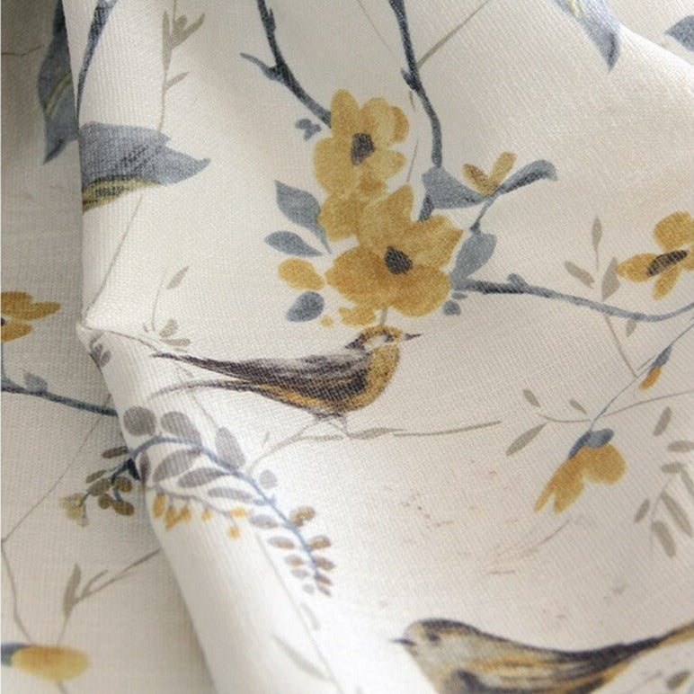 • Style et ambiance : Ambiance aquarelle et ornithologie; rideau Ardila avec motif oiseaux sur une toile blanche mi coton; tons bleu gris et ocre délavés.