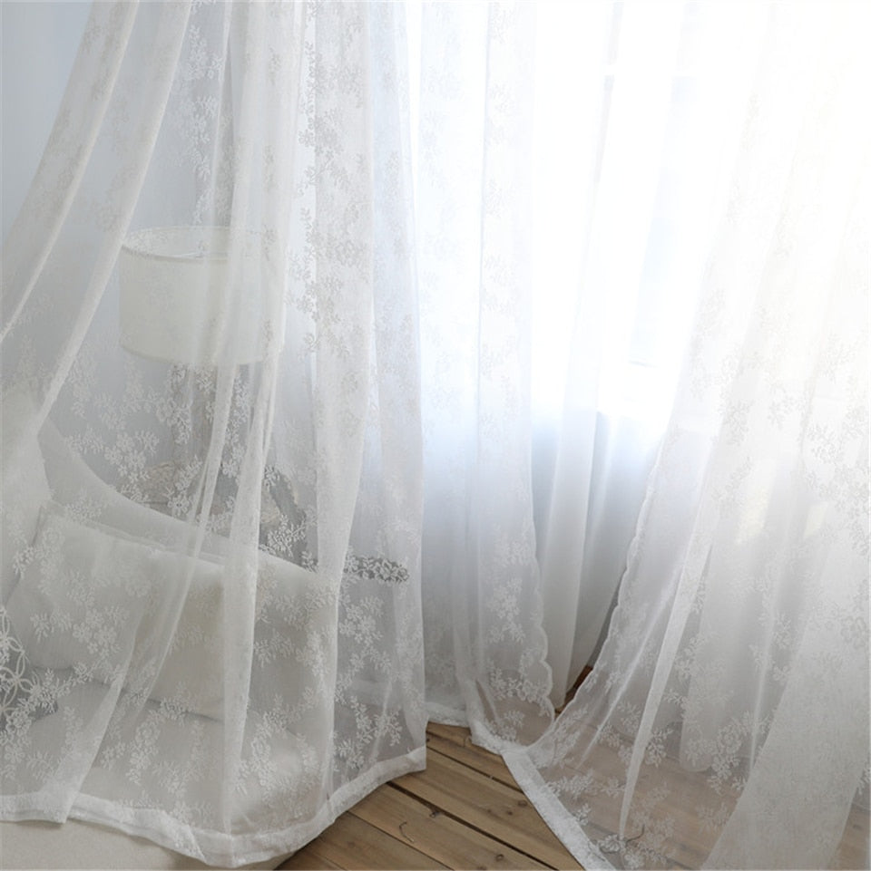 • Rideau voilage blanc dentelle (Rideau Voilage Sabina) avec motif floral brodé en dentelle blanche et fini latéral en ronds de bosses